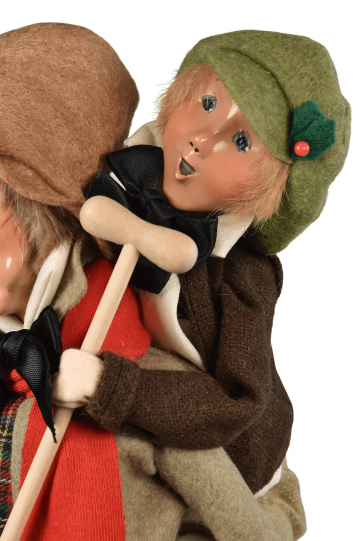 The Christmas Carol series has been a signature line for Byers' Choice since the 1980's. You need to look no further than the transformation of Dicken's beloved character Ebenezer Scrooge to discover the transforming powers of the Christmas season.This is a combination of 2 carollers as Tiny Tim perches on his fathers back.
