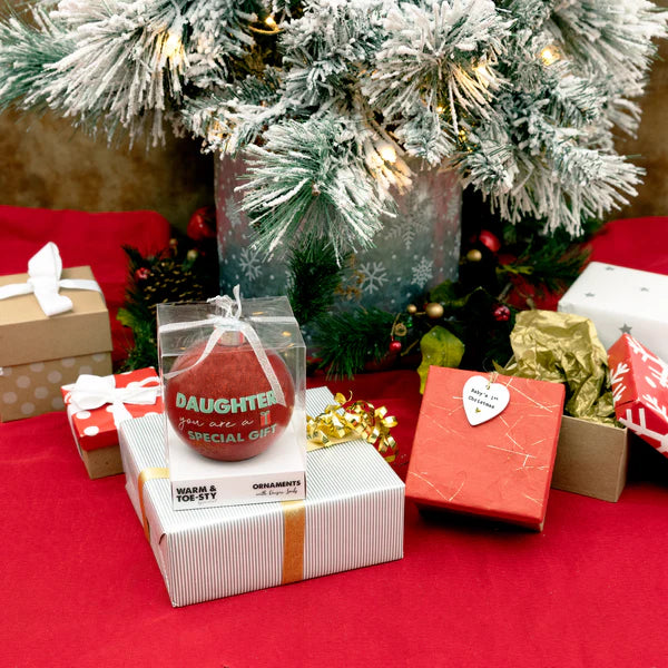 The ornament is adorned with a charming reindeer and the heartfelt sentiment: 'Daughter, You Are A Special Gift'—making it a meaningful keepsake for the holiday season. Inside, you’ll find a cozy surprise: a pair of unisex crew socks, rolled neatly within the ornament for a fun and functional gift.