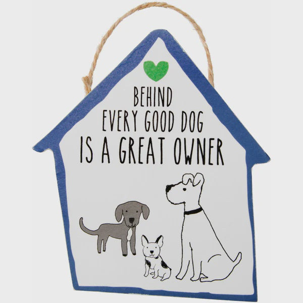 Celebrate the special bond between pups and their people with this charming house-shaped ornament, featuring the heartwarming message: 'Behind Every Good Dog Is a Great Owner.' With its cheerful blue border, trio of adorable illustrated dogs, and a sweet green heart accent, this piece is full of personality and love.
