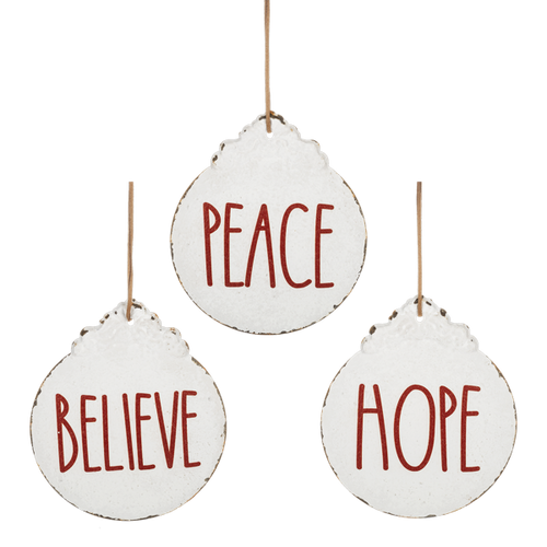 White Metal Ornament w Red Text